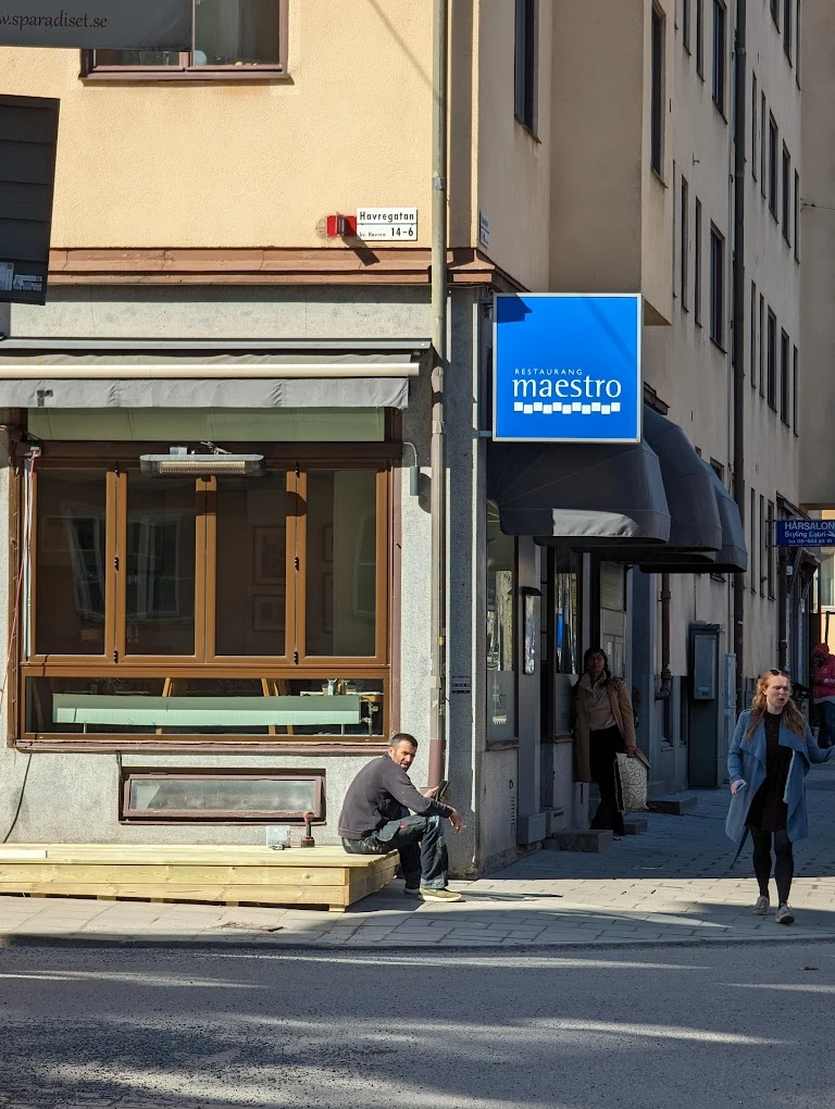 Vi hade sett fram emot att få äta den goda maten på Maestro. Vi hade bokat bord och visste att det fanns platser utomhus. Eftersom vi var på resande fot hade vi med oss vår hund i en barnvagn med nätfönster. Men där blev det tvärstopp på grund av försäkringsskäl.